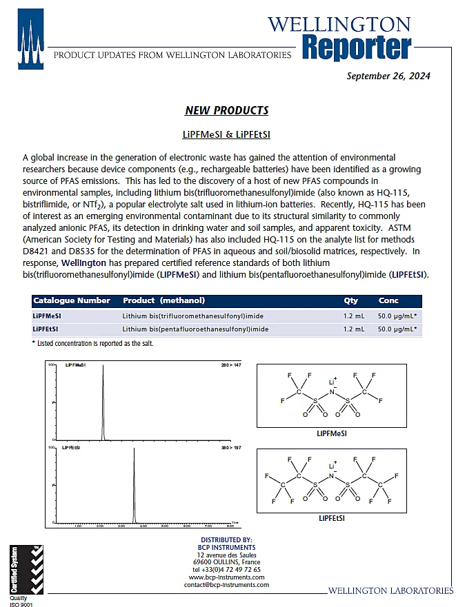 Notre gamme de standards PFAS pour vos analyses environnementales.Découvrez nos standards natifs de lithium bis(trifluorométhanesulfonyl)imide (LiPFMeSI) et de lithium bis(pentafluoroéthanesulfonyl)imide (LiPFEtSI).