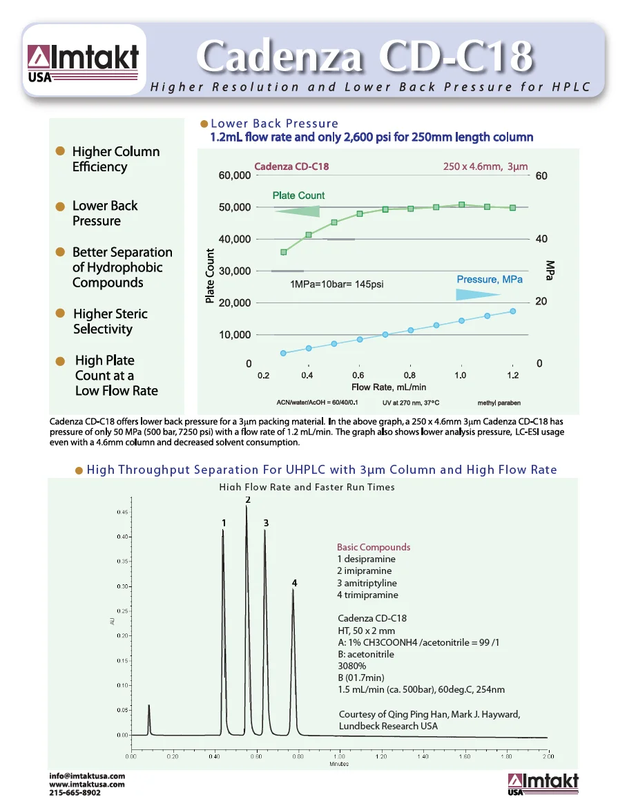 Les colonnes Cadenza CD-C18, par exemple, sont conçues pour offrir une résolution élevée et une efficacité de séparation supérieure grâce à leur matériau de remplissage de 3 µm.