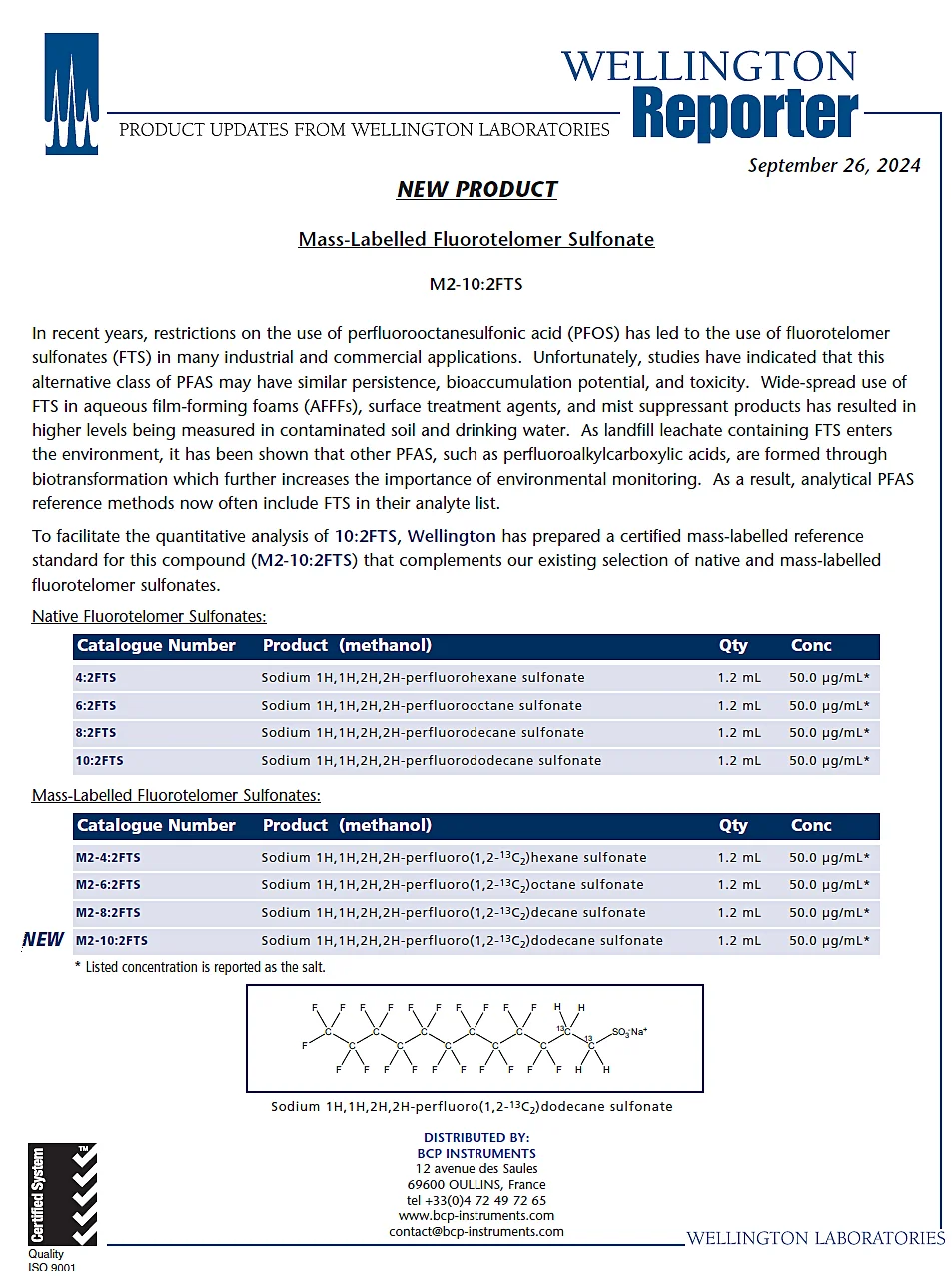 To facilitate quantitative analysis of 10:2FTS, Wellington has prepared a certified labelled reference standard for this compound (M2-10:2FTS), which complements our existing selection of native and mass-labelled sulfonate fluorotelomers.