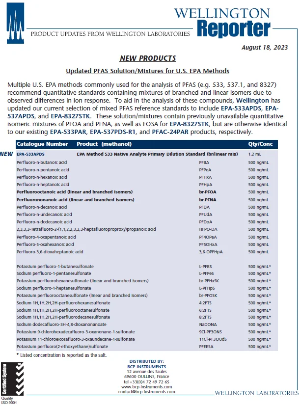 Les substances perfluoroalkylées et polyfluoroalkylées (PFAS) suscitent une préoccupation croissante en raison de leur impact reconnu sur la santé humaine et l’environnement. Ainsi, face aux enjeux liés aux PFAS, il est primordial d’analyser ces substances à l’aide de standards analytiques afin de garantir la sécurité publique. C’est pourquoi BCP Instruments propose en exclusivité en France et en Belgique de nombreux CRM (Certified Reference Materials) compatibles avec la méthode EPA-533, préparés par les Laboratoires Wellington.